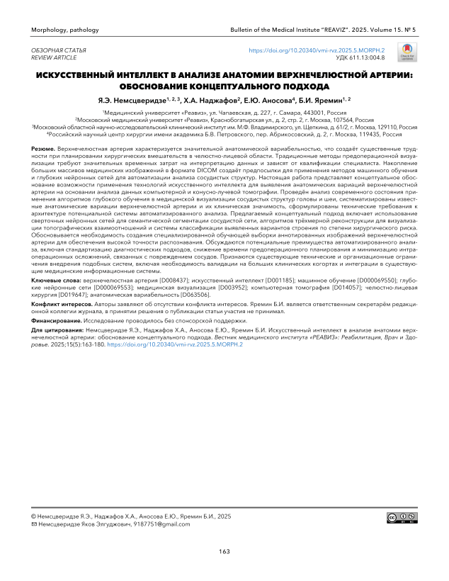 Верхнечелюстная артерия характеризуется значительной анатомической вариабельностью, что создаёт существенные трудности при планировании хирургических вмешательств в челюстно-лицевой области. Традиционные методы предоперационной визуализации требуют значительных временных затрат на интерпретацию данных и зависят от квалификации специалиста. Накопление больших массивов медицинских изображений в формате DICOM создаёт предпосылки для применения методов машинного обучения и глубоких нейронных сетей для автоматизации анализа сосудистых структур. Настоящая работа представляет концептуальное обоснование возможности применения технологий искусственного интеллекта для выявления анатомических вариаций верхнечелюстной артерии на основании анализа данных компьютерной и конусно-лучевой томографии. Проведён анализ современного состояния применения алгоритмов глубокого обучения в медицинской визуализации сосудистых структур головы и шеи, систематизированы известные анатомические вариации верхнечелюстной артерии и их клиническая значимость, сформулированы технические требования к архитектуре потенциальной системы автоматизированного анализа. Предлагаемый концептуальный подход включает использование сверточных нейронных сетей для семантической сегментации сосудистой сети, алгоритмов трёхмерной реконструкции для визуализации топографических взаимоотношений и системы классификации выявленных вариантов строения по степени хирургического риска. Обосновывается необходимость создания специализированной обучающей выборки аннотированных изображений верхнечелюстной артерии для обеспечения высокой точности распознавания. Обсуждаются потенциальные преимущества автоматизированного анализа, включая стандартизацию диагностических подходов, снижение времени предоперационного планирования и минимизацию интраоперационных осложнений, связанных с повреждением сосудов. Признаются существующие технические и организационные ограничения внедрения подобных систем, включая необходимость валидации на больших клинических когортах и интеграции в существующие медицинские информационные системы.