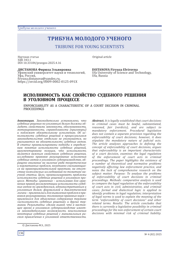 Tribune for Young Scientists некоторые аспекты исполнения отдельных видов судебных решений. Автором подчеркивается, что проблемы исполнимости судебных актов, выносимых в ходе рассмотрения уголовных дел, и их реальная исполняемость нуждаются в дополнительном исследовании.