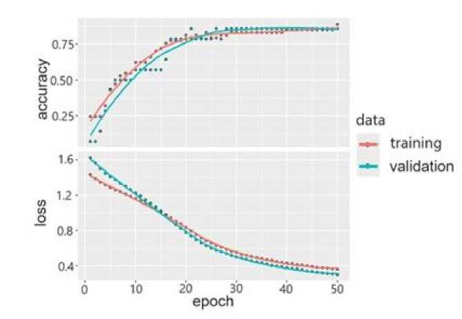 Рис. 2. Динамика оценок потерь (loss) и точности (accuracy) нейросетевой модели при обучении