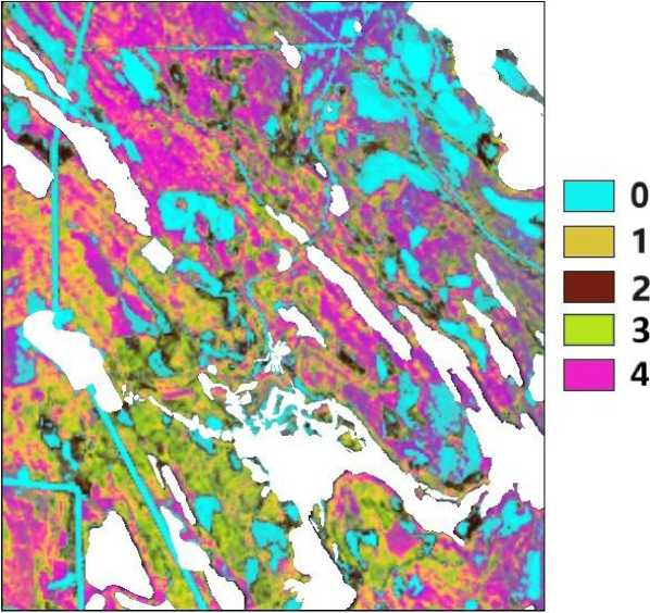 Рис. 3. Грид типов биотопов, построенный на основе двухслойного персептрона (20 > 10 > 5); 0 - открытые вырубки, 1 - разреженные вырубки, 2 - молодняки, 3 - лиственные леса, 4 - хвойные и смешанные леса; белыми полигонами закрыты болота, луга, озера, населенные пункты