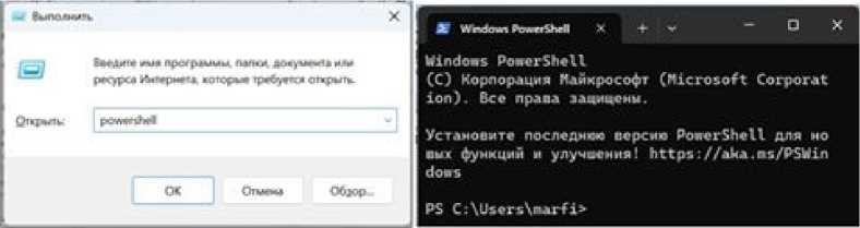 Вызываем окно Выполнить, нажав соче- тание клавиш Win + R, вводим с клавиатуры команду powershell, OK. Появляется окно командной строки.