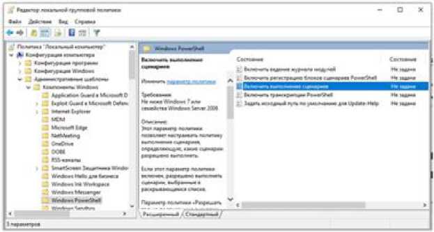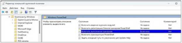 В появившемся окне Редактор локальной групповой политики необходимо включить выполнение сценариев. Для этого в левой части окна поочередно отрываем вкладки Конфигурация компьютера \ Администра- тивные шаблоны \ Компоненты Windows \ Windows PowerShell и в правой части окна дважды кликаем на пункте Включить выполнение сценариев.