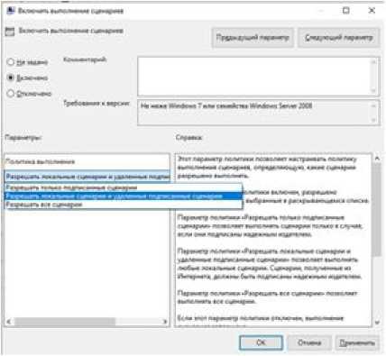 В появившемся окне Включить выполне- выбрать Разрешать локальные сценарии и ние сценариев выбрать пункт Включено и, удаленные подписанные сценарии, OK. нажав на серую полосу в левой части окна,