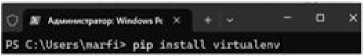 Третий этап. Создание виртуального выше: Win + R, powershell, OK). Вводим ко- окружения манду pip install virtualenv , Enter.