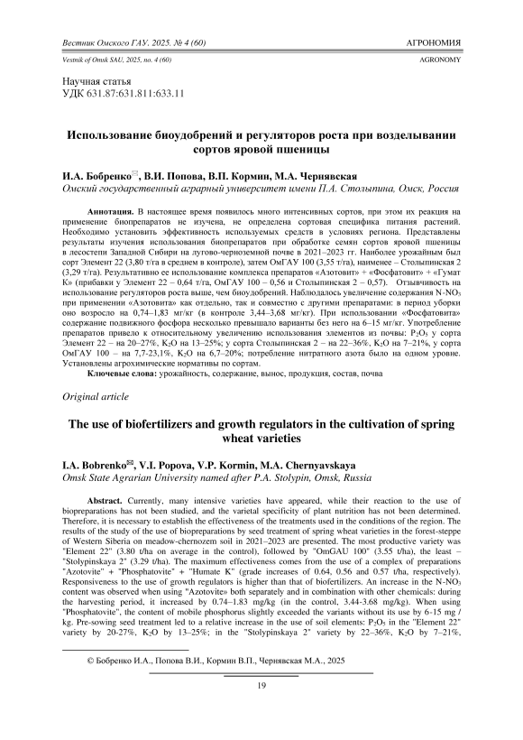 В настоящее время появилось много интенсивных сортов, при этом их реакция на применение биопрепаратов не изучена, не определена сортовая специфика питания растений. Необходимо установить эффективность используемых средств в условиях региона. Представлены результаты изучения использования биопрепаратов при обработке семян сортов яровой пшеницы в лесостепи Западной Сибири на лугово-черноземной почве в 2021–2023 гг. Наиболее урожайным был сорт Элемент 22 (3,80 т/га в среднем в контроле), затем ОмГАУ 100 (3,55 т/га), наименее – Столыпинская 2 (3,29 т/га). Результативно ее использование комплекса препаратов «Азотовит» + «Фосфатовит» + «Гумат К» (прибавки у Элемент 22 – 0,64 т/га, ОмГАУ 100 – 0,56 и Столыпинская 2 – 0,57). Отзывчивость на использование регуляторов роста выше, чем биоудобрений. Наблюдалось увеличение содержания N-NO3 при применении «Азотовита» как отдельно, так и совместно с другими препаратами: в период уборки оно возросло на 0,74–1,83 мг/кг (в контроле 3,44–3,68 мг/кг). При использовании «Фосфатовита» содержание подвижного фосфора несколько превышало варианты без него на 6–15 мг/кг. Употребление препаратов привело к относительному увеличению использования элементов из почвы: P2О5 у сорта Элемент 22 – на 20–27%, K2О на 13–25%; у сорта Столыпинская 2 – на 22–36%, K2О на 7–21%, у сорта ОмГАУ 100 – на 7,7-23,1%, K2О на 6,7–20%; потребление нитратного азота было на одном уровне. Установлены агрохимические нормативы по сортам.