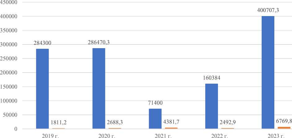 Также следует выделить, что в Саратовской области за период с 2019 по 2023 г. возрос физический объем производства маслосемян подсолнечника, получаемых от гибридных сортов (рис. 2). Объем производства возрос с 284,3 тыс. до 400,7 тыс. ц. Это связано прежде всего со значительным ростом средней реализационной цены с 1 811,2 до 6 769,8 руб. за 1 ц.