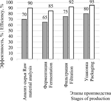 Рисунок 1 демонстрирует сравнительную эффективность традиционных методов и подходов с использованием ИИ на ключевых этапах пивоварения.