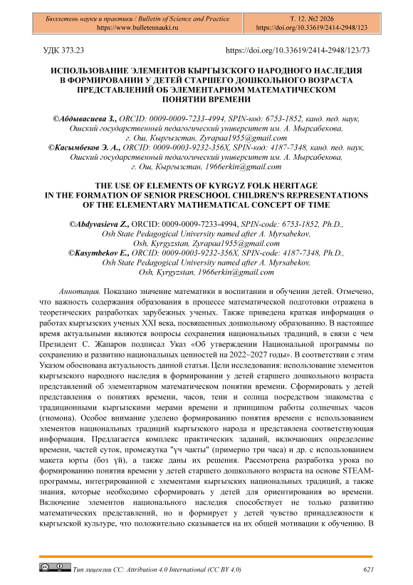 Текст научной статьи Использование элементов кыргызского народного наследия в формировании у детей старшего дошкольного возраста представлений об элементарном математическом понятии времени