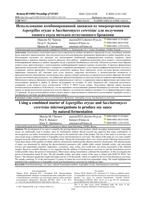 Актуальность получения соевого соуса определяется особым интересом к продуктам из сои, способным заменить белок животного происхождения. Для получения соуса методом брожения традиционно применяются грибы Aspergillus oryzae. Исследования последних лет показали, что использование комбинаций микроорганизмов позволяет сократить сроки ферментации и повысить пищевую ценность продукта. Цель работы – разработка рецептуры соуса соевого с использованием комбинированной закваски из грибов Aspergillus oryzae и дрожжей Saccharomyces cerevisiae. Объектом изучения стали образцы соевого соуса, приготовленные с использованием комбинированной закваски в разных количествах. В процессе ферментации проводились визуальные наблюдения и измерялось содержание растворимых сухих веществ рефрактометрическим методом и содержание этанола ареометром. Оптимальное количество закваски было определено путем изучения физико-химических параметров (показатель pH, массовая доля сухих веществ, титруемая кислотность и антиоксидантная активность) и органолептических (внешний вид, консистенция, вкус, аромат и общая оценка вкуса и аромата) полученных образцов. На основе научных источников предполагалось, что добавление дрожжей Saccharomyces cerevisiae позволит сократить время ферментации. Наблюдения в процессе брожения подтвердили первоначальную гипотезу о сокращении периода ферментации при совместном использовании дрожжей и грибов. В данном исследовании он составил 30 дней. Показатель pH, титруемая кислотность, содержание сухих веществ соуса соответствуют ГОСТу Р 58434 Соусы соевые. Полученные образцы имеют высокую антиоксидантную активность 10,46 ммоль/л, что мы связываем с использованием дрожжей Saccharomyces cerevisiae. Наилучшую оценку по органолептическим показателем получил образец, где количество закваски составило 3% от ферментируемого сырья (15 граммов). По результатам работы можно сделать вывод о перспективности совместного использования Aspergillus oryzae и Saccharomyces cerevisiae для приготовления соуса соевого.