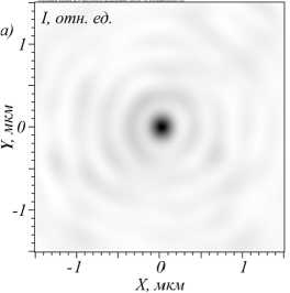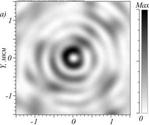 В соответствии с формулой (1) в центре должно быть кольцо, так как присутствует вихрь (рис. 1б), однако на рис. 1а изображено круглое фокусное пятно. Причина этого в том, что максимум интен- сивности находится в Ez-компоненте поля, а поперечные компоненты выражены не так сильно (рис. 3). В то же время вихря в проекции поля Ez нет (рис. 2в).
