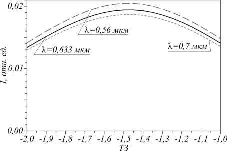 На рис. 8 показана зависимость максимума интенсивности от величины ТЗ для трех разных длин волн.