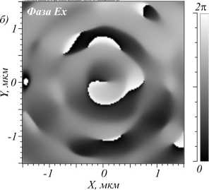 Рис. 2. Интенсивность света в фокусной плоскости металинзы (а) и фаза проекций электрического вектора Ex, Ez (б, в)