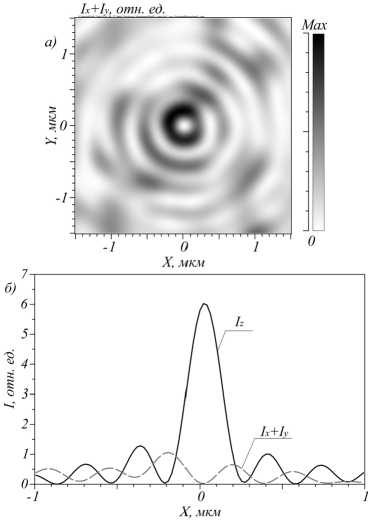 Рис. 3. Интенсивность поперечных компонент (а) и сечение вдоль оси X поперечных и продольной компонент электрического поля в фокусной плоскости