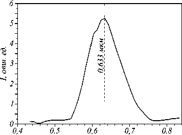 Работоспособность данной металинзы сохраняется в некотором диапазоне длин волн. На рис. 4 показана зависимость интенсивности в фокусном пятне на оптической оси от длины волны падающего света в диапазоне от 0,433 до 0,833 мкм с шагом 10 нм. Данное моделирование было проведено методом FDTD в коммерческом программном пакете FullWave (RSoft – LightTec). Сетка разбиения вдоль всех трех осей была выбрана λ/30, размер области моделирования составил 8,2×8,2×1,933 мкм, шаг дискретизации по времени был выбран как максимальный устойчивый и равен cT = 0,0113 мкм, где c – скорость света в вакууме.