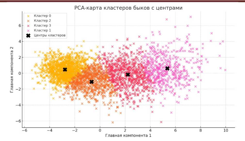 В дополнение к визуализации самих животных на график были нанесены центры каждого кластера, вычисленные на основе трансформированных координат центров масс в исходном признаковом пространстве. Эти центры отображены в виде маркировок «X» и отражают усредненную племенную структуру соответствующей группы. Такая доработка позволяет не только понимать внутреннюю организацию каждого кластера, но и использовать полученные координаты в качестве эталонных точек при прогнозной классификации новых животных. Например, при появлении быка с неизвестной кластерной принадлежностью можно оценить его координаты по PCA и определить, к какому типу он ближе всего - по эвклидову расстоянию до центров.
