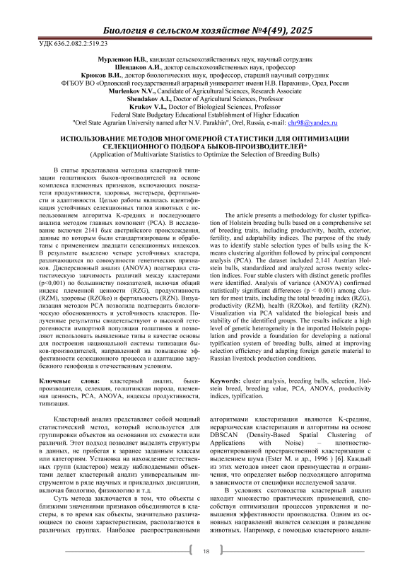 В статье представлена методика кластерной типизации голштинских быков-производителей на основе комплекса племенных признаков, включающих показатели продуктивности, здоровья, экстерьера, фертильности и адаптивности. Целью работы являлась идентификация устойчивых селекционных типов животных с использованием алгоритма K-средних и последующего анализа методом главных компонент (PCA). В исследование включен 2141 бык австрийского происхождения, данные по которым были стандартизированы и обработаны с применением двадцати селекционных индексов. В результате выделено четыре устойчивых кластера, различающихся по совокупности генетических признаков. Дисперсионный анализ (ANOVA) подтвердил статистическую значимость различий между кластерами (p<0,001) по большинству показателей, включая общий индекс племенной ценности (RZG), продуктивность (RZM), здоровье (RZОko) и фертильность (RZN). Визуализация методом PCA позволила подтвердить биологическую обоснованность и устойчивость кластеров. Полученные результаты свидетельствуют о высокой гетерогенности импортной популяции голштинов и позволяют использовать выявленные типы в качестве основы для построения национальной системы типизации быков-производителей, направленной на повышение эффективности селекционного процесса и адаптацию зарубежного генофонда к отечественным условиям.