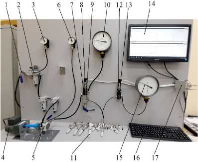 9 — раздаточный блочный коллектор; 10 — манометр деформационный образцовый; 11 — исследуемый вакуумный эжектор; 12 — датчик абсолютного давления МИДА-ДА-15; 14 — монитор; 15 — вакууметр деформационный образцовый (класс точности 0,4); 16 — клавиатура компьютера; 17 — устройство связи МИДА-УС-410