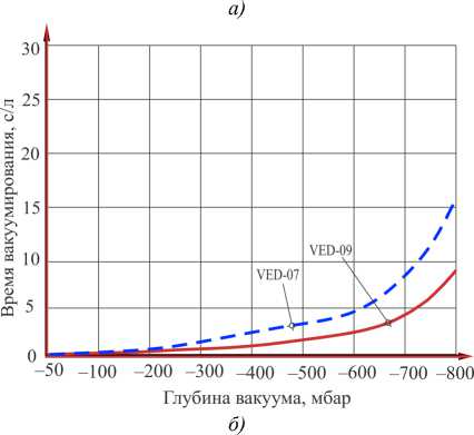 Рис. 6. Диаграммы зависимости времени создания вакуума в одном литре объема для эжекторов серии VED: а — по данным авторов; б — по данным каталога фирмы