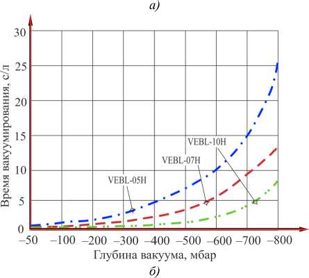 Рис. 4. Диаграммы зависимости времени создания вакуума в одном литре объема для эжекторов серии VEBL: а — по данным авторов; б — по данным каталога фирмы