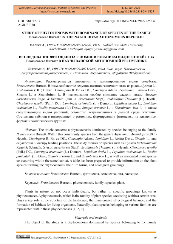 During the research, a phytocoenosis was identified in which species of the family Brassicaceae Burnett were particularly abundant within the local flora. This phytocoenosis includes species from the genera Alyssum L., Arabidopsis (DC.) Heynh., Chorispora R. Br. ex DC., Conringia Adans., Lepidium L., Neslia Desv., Sinapis L., and Sisymbrium L. In the flora of the Nakhchivan Autonomous Republic, there are 13 species of the genus Alyssum L., 3 species of Arabidopsis (DC.) Heynh., 2 species of Chorispora R. Br. ex DC., 4 species of Conringia Adans., 10 species of Lepidium L., 2 species of Neslia Desv., 1 species of Sinapis L., and 4 species of Sisymbrium L. [2].