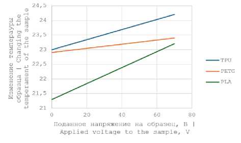 Нагрев всех образцов при подаче напряжения 70 В оказался незначительным (ΔT < 2 °C), что является прямым следствием их высокого удельного сопротивления. Несмотря на то, что образец PETG + PEDOT : PSS обладал наименьшим сопротивлением и, следовательно, в нем рассеивалась наибольшая мощность (~0.29 Вт), его нагрев оказался минимальным (ΔT = 0.5 °C). Это может объясняться лучшей теплопроводностью материала PETG по сравнению с PLA и TPU, что способствовало более эффективному отводу тепла в держатель и окружающую среду (график 3) [10–11].