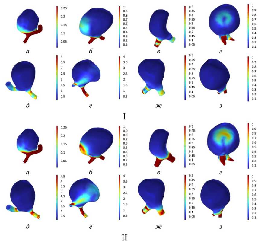 В здоровых артериях значения пристеночных касательных напряжений равны 1-2,5 Па. Аномально низкие или высокие значения пристеночных касательных напряжений негативно сказываются на состоянии сосудистой стенки [30; 31]. Низкие значения пристеночных касательных напряжений (< 0,5 Па) наблюдаются в зонах роста аневризмы (купол и шейка) [32; 33]. В данных областях происходит ремоделирование сосудистой стенки из-за воспалительных процессов [34]. Высокие значения пристеночных касательных напряжений (> 4 Па) в сложных геометрических местах сосудистой сети (бифуркации и разветвления) свидетельствуют о зарождении аневризм [35]. Высокие уровни сдвиговых напряжений приводят к активации воспалительных реакций, изменению экспрессии генов и повышению чувствительности клеток сосудистой стенки к механическим раздражителям, увеличивая риск прогрессирования патологического процесса. Анализ того, насколько сильно изменяется направление кровотока в непосредственной близости к сосудистой стенки, имеет решающее значение в изучении риска разрыва. Высокие значения индекса колебаний пристеночных касательных напряжений (> 0,1) могут свидетельствовать о зарождающихся процессах разрушения эндотелиального слоя сосудистой стенки, а также о формировании аневризмы.