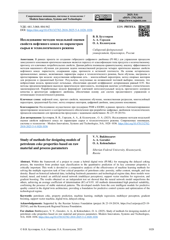 В рамках проекта по созданию гибридного цифрового двойника (PI-ML) для управления процессом замедленного коксования критически важным является переход от классификации типа продукта к количественному прогнозу его ключевых потребительских свойств. Данная работа посвящена сравнительному анализу эффективности методов машинного обучения для решения задачи множественной регрессии четырех критически важных свойств нефтяного кокса: пористости, содержания серы, прочности и истинной плотности. На основе исторических промышленных данных, включающих параметры сырья и технологического режима, были обучены, настроены и протестированы три модели: искусственная нейронная сеть – многослойный персептрон, метод опорных векторов для регрессии и градиентный бустинг. Результаты, полученные на независимой тестовой выборке, показали, что нейросетевая модель превосходит остальные, обеспечивая средний коэффициент детерминации равный 0,93. Все методы продемонстрировали высокую практическую пригодность, подтвердив наличие устойчивых статистических закономерностей. Разработанные модели формируют ключевой интеллектуальный модуль прогнозного контроля качества в архитектуре цифрового двойника, обеспечивая основу для систем предиктивного управления и оптимизации технологического режима.