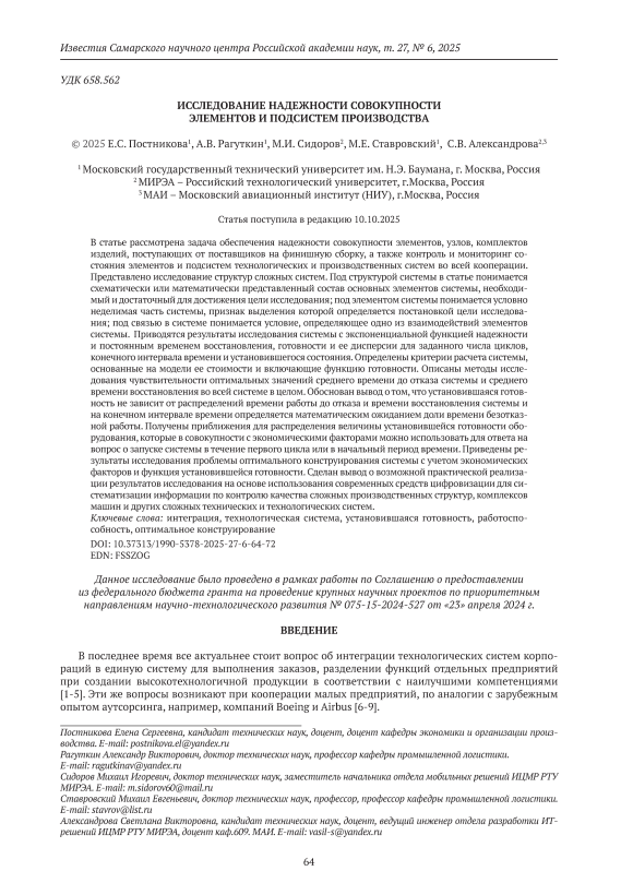 В статье рассмотрена задача обеспечения надежности совокупности элементов, узлов, комплектов изделий, поступающих от поставщиков на финишную сборку, а также контроль и мониторинг состояния элементов и подсистем технологических и производственных систем во всей кооперации. Представлено исследование структур сложных систем. Под структурой системы в статье понимается схематически или математически представленный состав основных элементов системы, необходимый и достаточный для достижения цели исследования; под элементом системы понимается условно неделимая часть системы, признак выделения которой определяется постановкой цели исследования; под связью в системе понимается условие, определяющее одно из взаимодействий элементов системы. Приводятся результаты исследования системы с экспоненциальной функцией надежности и постоянным временем восстановления, готовности и ее дисперсии для заданного числа циклов, конечного интервала времени и установившегося состояния. Определены критерии расчета системы, основанные на модели ее стоимости и включающие функцию готовности. Описаны методы исследования чувствительности оптимальных значений среднего времени до отказа системы и среднего времени восстановления во всей системе в целом. Обоснован вывод о том, что установившаяся готовность не зависит от распределений времени работы до отказа и времени восстановления системы и на конечном интервале времени определяется математическим ожиданием доли времени безотказной работы. Получены приближения для распределения величины установившейся готовности оборудования, которые в совокупности с экономическими факторами можно использовать для ответа на вопрос о запуске системы в течение первого цикла или в начальный период времени. Приведены результаты исследования проблемы оптимального конструирования системы с учетом экономических факторов и функция установившейся готовности. Сделан вывод о возможной практической реализации результатов исследования на основе использования современных средств цифровизации для систематизации информации по контролю качества сложных производственных структур, комплексов машин и других сложных технических и технологических систем.