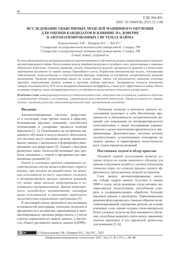 В статье представлено исследование влияния алгоритмов машинного обучения на уровень доверия кандидатов в процессе автоматизированного найма. Использованы модели линейной регрессии и случайного леса, реализованные с помощью библиотеки Scikit-learn. Основное внимание уделено объяснимости моделей, прозрачности решений и соответствию требованиям регламента по защите данных Европейского союза. Разработана математическая модель, учитывающая поведенческие, психологические и технологические факторы, влияющие на восприятие алгоритмических решений кандидатами. Проведeн регрессионный анализ на основе данных опроса 120 респондентов, выявлены ключевые признаки, определяющие уровень доверия к системам подбора персонала.