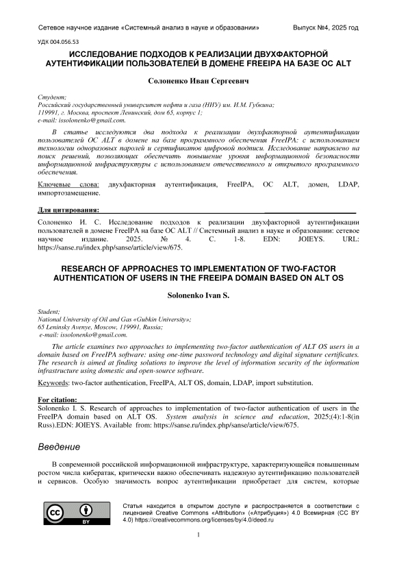 В статье исследуются два подхода к реализации двухфакторной аутентификации пользователей ОС ALT в домене на базе программного обеспечения FreeIPA: с использованием технологии одноразовых паролей и сертификатов цифровой подписи. Исследование направлено на поиск решений, позволяющих обеспечить повышение уровня информационной безопасности информационной инфраструктуры с использованием отечественного и открытого программного обеспечения.