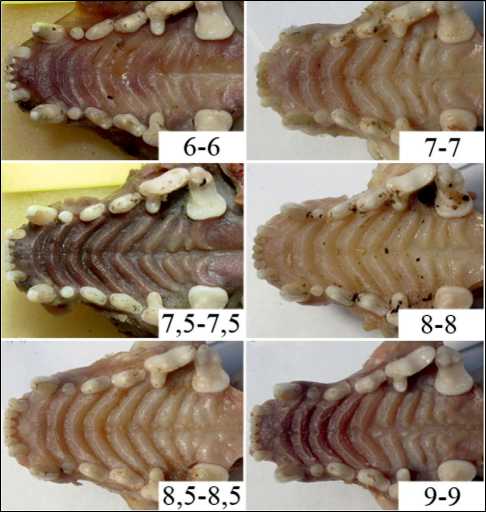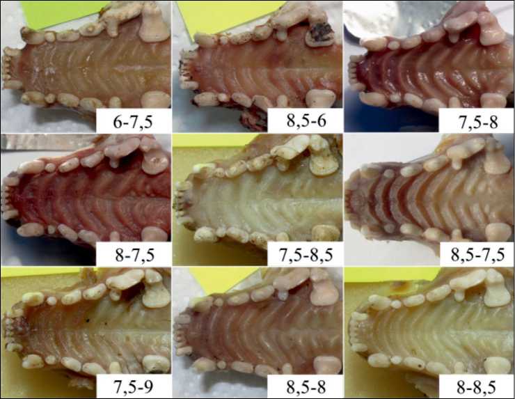 Расположенные между премолярами и молярами интермолярные небные складки встречаются в количестве от 6 до 9. Они показывают как право-левосторонне симметричные (рис. 2), так и асимметричные картины (рис. 3). Большинство рассматриваемых особей (69 из 91) имели равные количества интермолярных складок на правой и левой сторонах нёба, измеренных в количестве полноразмерных, плюс половинчатых складок, независимо от того, соединены или нет каким-то концом половинчатая и рядом расположенная полноразмерная, либо две полноразмерных. Пять-шесть нёбных складок, выходящие периферийными концами на премоляры и боковую сторону моляра, обычно полноразмерные, дугообразные и симметричные. Их смешанные морфотипы обнаружены у пяти животных, и такие морфотипы