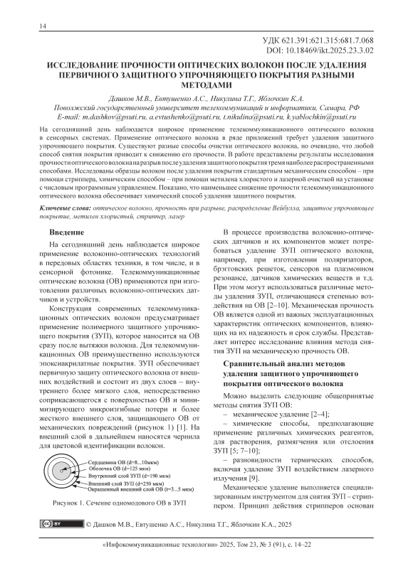 В процессе производства волоконно-оптических датчиков и их компонентов может потребоваться удаление ЗУП оптического волокна, например, при изготовлении поляризаторов, брэгговских решеток, сенсоров на плазмонном резонансе, датчиков химических веществ и т.д. При этом могут использоваться различные методы удаления ЗУП, отличающиеся степенью воздействия на ОВ [2–10]. Механическая прочность ОВ является одной из важных эксплуатационных характеристик оптических компонентов, влияющих на их надежность и срок службы. Представляет интерес исследование влияния метода снятия ЗУП на механическую прочность ОВ.