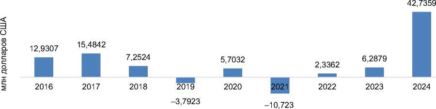 Рис. 4 . Накопленный объем прямых китайских инвестиций в Россию за период 2016–2024 гг.