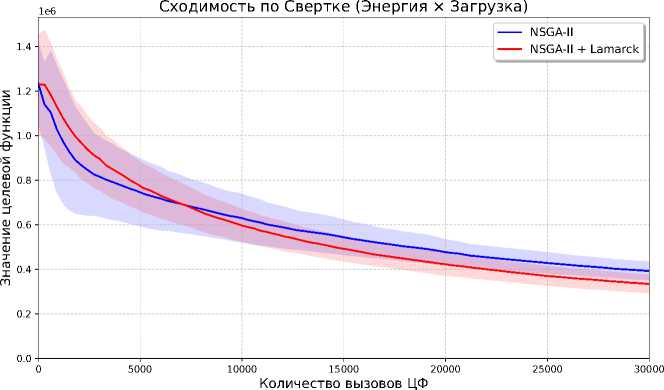 100 ВЗ по 10 узлам добавление эволюционных принципов Ламарка не оказывает положительного эффекта на ресурсную эффективность планирования. Более того, дополнительные циклы локальных улучшений увеличивают ресурсную стоимость вычислений на фоне NSGA-II.