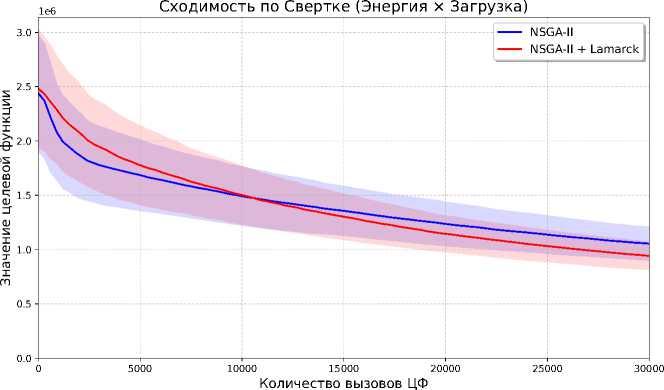 Вопрос ресурсной эффективности алгоритма на основе эволюции Ламарка не является тривиальным. С одной стороны, можно предположить, что усиление компоненты локального поиска в рамках эволюционного алгоритма должно существенным образом улучшить качество популяции в целом и тем самым ускорить сходимость алгоритма.