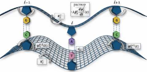 Fj(t) = -X₽J-* (t)+ M (t), d ф j где слагаемое -XPi —— (t) моделирует эффекты дисси-j dt пации, обусловленные взаимодействием с окружающей молекулу ДНК жидкостью, слагаемое Mi (t) - торсионный момент [24] (рис. 2). В данном исследовании нами были взяты следующие значения вязкости: λ = 0,9; λ = 1,0 и λ = 1,1, где λ=1,0 – это нормальные условия, λ = 0,9 – снижение вязкости среды, а λ = 1,1 – увеличение.