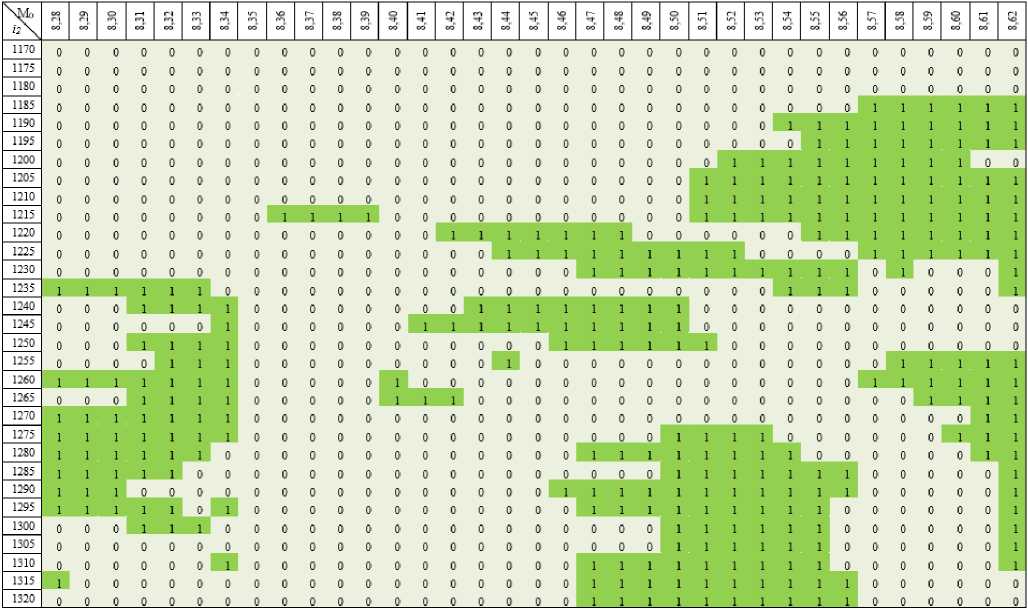 Таблицы были заполнены по следующему принципу: по вертикали была отмечена правая граница торсионного воздействия i 2 , которая отсчитывалась от начала выбранного участка гена (левая граница равна левой границе промоторной области, т.е. 663-й пара оснований). По горизонтали отмечены значения величины торсионного момента M 0 . Значения в таблице отражают размер и наличие дополнительных зон ОС при определенно заданных параметрах, т.е. 1 - это наличие дополнительной зоны ОС значительного размера, а 0 - наличие дополнительной зоны ОС незначительного размера или ее отсутствие.
