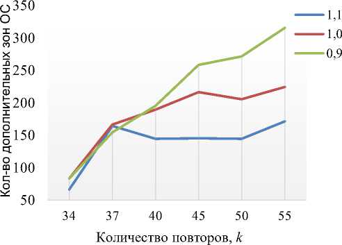 При сравнительном анализе проведенных расчетов установлено, что CAA-вставка в 25 положение оказывает влияние на стабильность CAG -тракта как при нормальных условиях к = 34, так и в аномалии к > 34 (рис. 5, а ). Однако стоит отметить, что при отсутствии CAA-вставок, присутствует зона пенетрантности при к > 37, после которой происходит увеличение количества дополнительных зон ОС, при этом при к < 37 вязкость не оказывает достоверного влияния на стабильность CAG -тракта, так как количество дополнительных зон ОС имеет незначительное отличие при различных значениях вязкости (рис. 5, б) . При к > 40 было зафиксировано увеличение числа дополнительных зон ОС при X = 0,9 относительно X = 1,0 и уменьшение при X = 1,1.
