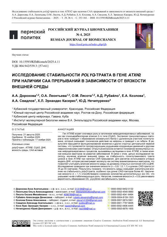 Ген ATXN2 играет ключевую роль в патогенезе нейродегенеративных заболеваний, таких как спиноцеребеллярная атаксия 2-го типа (СЦА2). Экспансия тринуклеотидных повторов в гене приводит к образованию аномального белка с удлиненным участком полиглутамина, который оказывает токсическое действие на нейроны и приводит к их гибели. В результате нарушается функционирование мозжечка и других структур центральной нервной системы, что проявляется прогрессирующим ухудшением координации движений и другими неврологическими симптомами. Открытым вопросом остается понимание молекулярных ос-нов нейродегенеративных процессов, вызываемых мутациями в гене ATXN2, а также влияние внешних факторов на развитие заболеваний. В связи с этим, целью исследования яв-лялось изучение влияния внешней среды на стабильность полиглутаминового тракта (polyQ) в гене ATXN2 при наличии CAA-прерывания. Для расчетов использовали угловую модель ДНК, которая рассматривает молекулу как систему взаимосвязанных маятников, что позволяет учитывать влияние вязкости среды на динамику открытых состояний (ОС) в ДНК. Исследование проводили при значениях вязкости (λ = 0,9; 1,0; 1,1) и длинах CAG-тракта (от 35 до 55 повторов). Результаты показали, что вязкость среды оказывает значительное влияние на стабильность polyQ-тракта, особенно при длине CAG-повторов более 40. Увеличение вязкости (λ = 1,1) способствовало снижению количества дополнительных зон ОС, что указывает на её стабилизирующую роль. Напротив, снижение вязкости (λ = 0,9) увеличивало вероятность образования ОС, усугубляя нестабильность тракта. Установлено, что CAA-вставки в polyQ-тракте оказывают влияние на образование дополни-тельных зон ОС и стабильность CAG тракта в зависимости от их локализации. Результаты проведенной работы служат предпосылками для понимания механизмов регуляции структурной устойчивости белков, связанных с нейродегенеративными заболеваниями. Полученные результаты могут способствовать разработке более эффективных терапевтических стратегий, направленных на стабилизацию аномальных polyQ-тракта, что потенциально за-медлит прогрессирование таких заболеваний, как спиноцеребеллярная атаксия и других полиглютаминовых патологий.