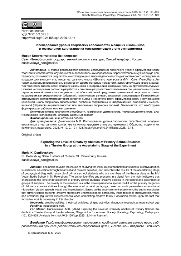 В статье раскрываются вопросы исследования первичного уровня сформированности творческих способностей обучающихся в дополнительном образовании через театрально-музыкальную деятельность, описываются результаты констатирующего этапа педагогического диагностического исследования младших школьников – участников театрального класса «Школы-студии вокала MV» г. Санкт-Петербурга. Автором выявлены и представлены в наглядной форме основные показатели, характеризующие уровень развития творческих способностей младших школьников в контрольной и экспериментальной группах испытуемых. Новизна исследования состоит в разработке и описании результатов использования специального инструментария первичной диагностики творческих способностей детей средствами музыкальной педагогики по таким параметрам, как эмоциональная (образная), пластическая, речевая, вокальная, импровизация. По итогам констатирующего эксперимента автором делается вывод о недостаточности сформированности у обучающихся начальной школы творческих способностей, особенно сопряженных с импровизацией, вокальной и эмоциональной (образной) выразительностью при выполнении творческих заданий. Заключается, что необходима формирующая работа в этом направлении.