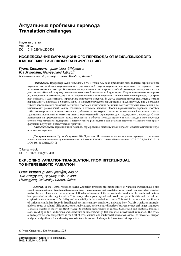 Профессор Хуан Чжунлянь в 90-х годах XX века предложил методологию вариационного перевода как глубокое переосмысление традиционной теории перевода, подчеркивая, что перевод – это не только эквивалентное преобразование между языками, но и процесс гибкой адаптации исходного текста с учетом потребностей и культурного фона конкретной читательской аудитории. Теория вариационного перевода, выходящая за рамки традиционных представлений о достоверности и эквивалентности перевода, подчеркивает гибкость и адаптивность переводчика в процессе перевода. В статье рассматривается применение теории вариационного перевода в межъязыковом и межсемиотическом варьировании, анализируется, как с помощью гибких переводческих стратегий решаются проблемы культурных различий, контекстуальных изменений и семиотических расхождений между исходным и целевым языками. Теория вариационного перевода способна гибко адаптироваться к множественным требованиям культурного фона и эмоциональной передачи, избегая культурных искажений и контекстуальных недоразумений, характерных для традиционного перевода. Статья направлена на предоставление новых перспектив в области межкультурного и мультимодального перевода, а также теоретической поддержки и практического руководства для решения проблем семиотической трансформации в будущей переводческой практике.