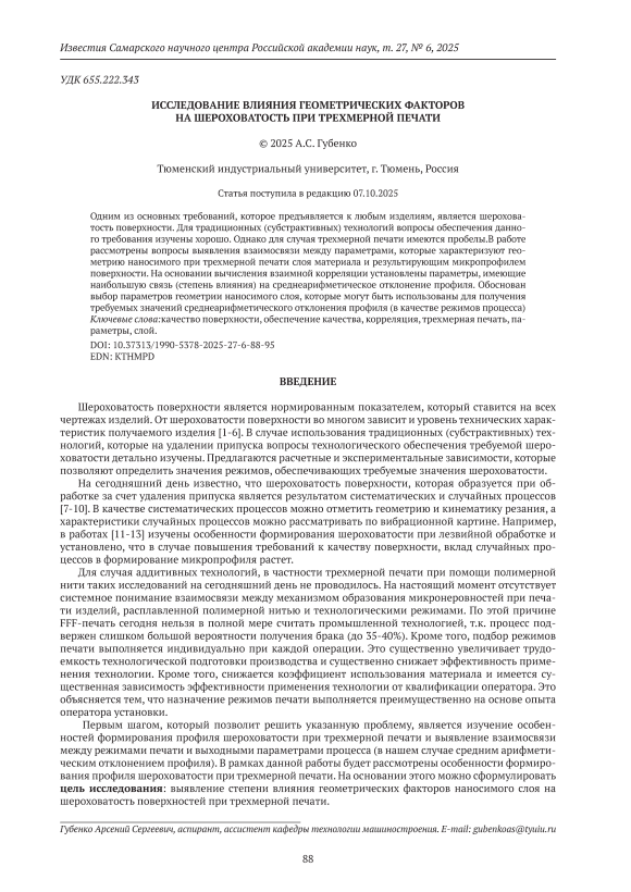 Одним из основных требований, которое предъявляется к любым изделиям, является шероховатость поверхности. Для традиционных (субстрактивных) технологий вопросы обеспечения данного требования изучены хорошо. Однако для случая трехмерной печати имеются пробелы.В работе рассмотрены вопросы выявления взаимосвязи между параметрами, которые характеризуют геометрию наносимого при трехмерной печати слоя материала и результирующим микропрофилем поверхности. На основании вычисления взаимной корреляции установлены параметры, имеющие наибольшую связь (степень влияния) на среднеарифметическое отклонение профиля. Обоснован выбор параметров геометрии наносимого слоя, которые могут быть использованы для получения требуемых значений среднеарифметического отклонения профиля (в качестве режимов процесса).