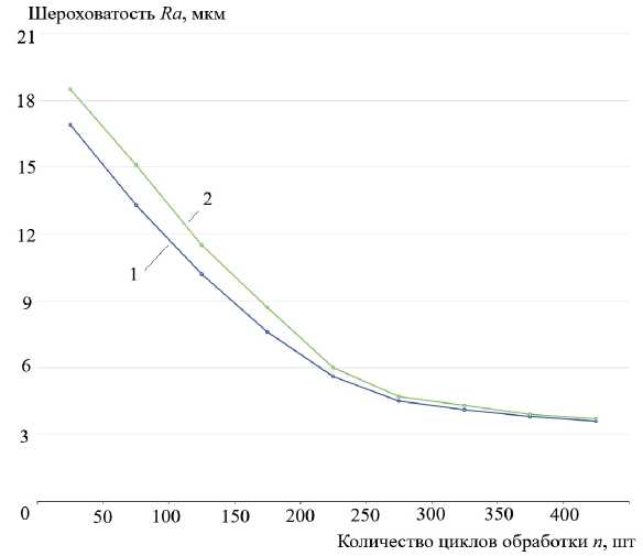 Fig. 3. Graph of the dependence of the change in roughness Ra of the surface of the ceramic coating of the sample on the number of cycles by abrasive flow machining n :