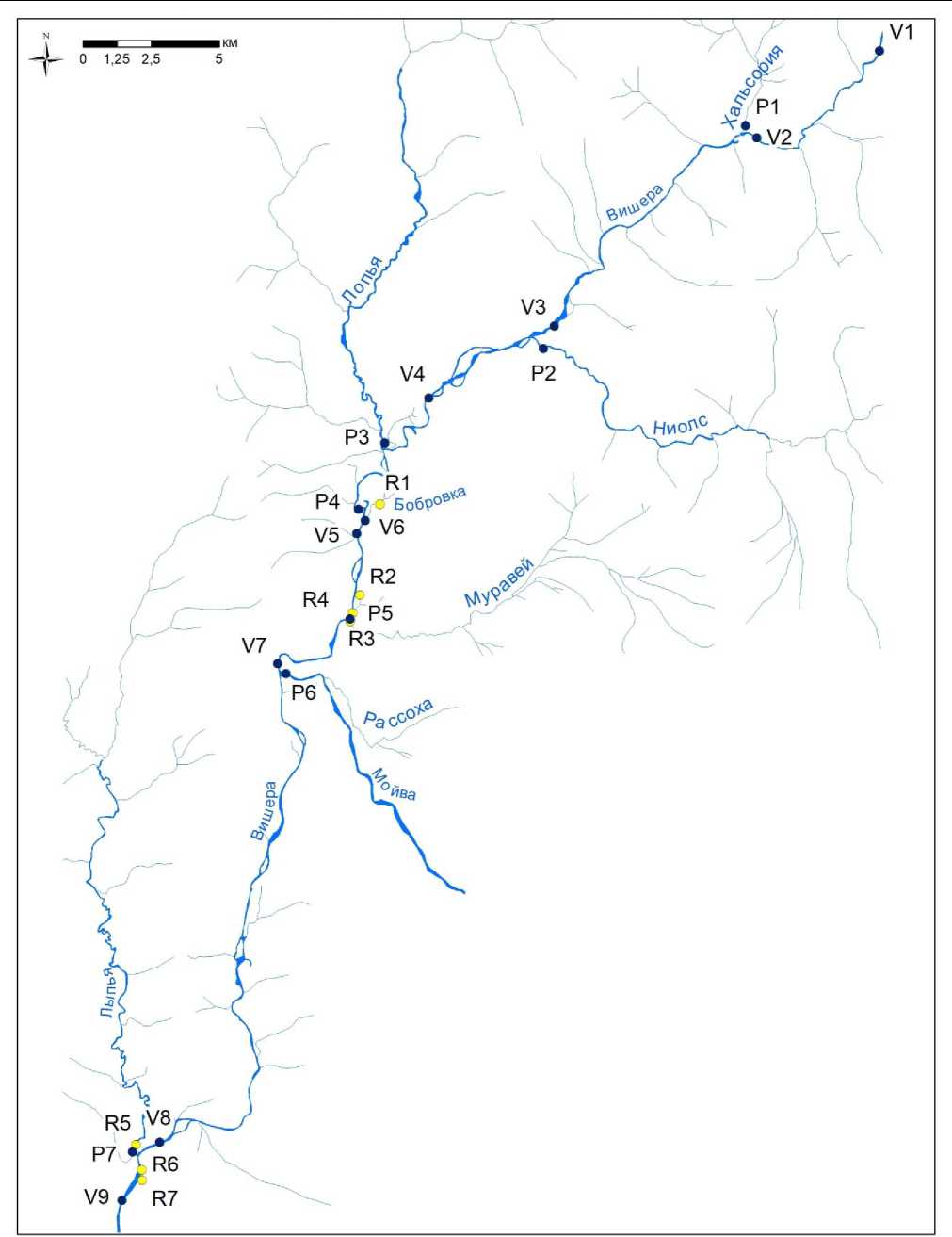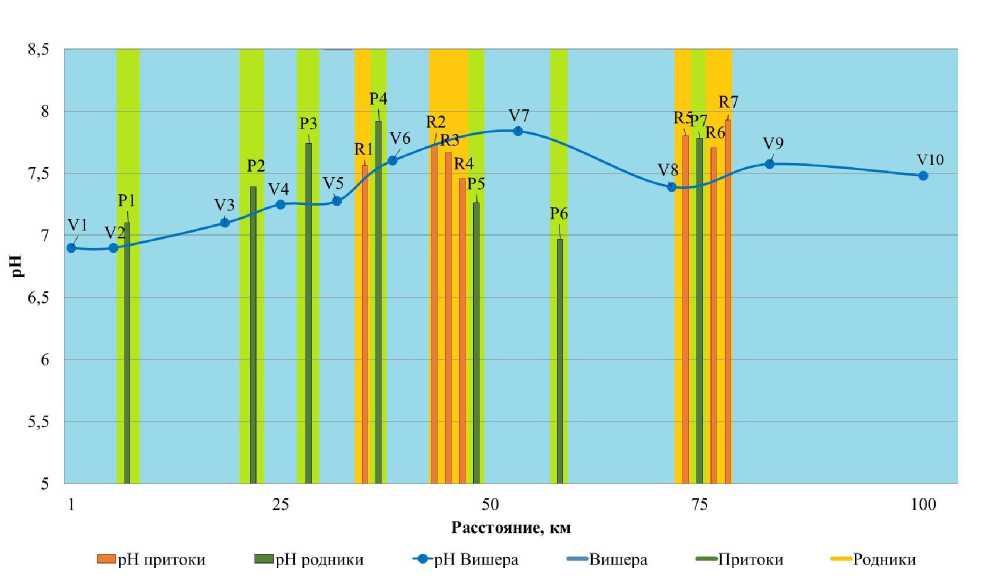Исследуемый объект (верхнее течение р. Вишеры) характеризуется сложными геологическими условиями, распространением карстующихся пород и существенной ролью субаквальной разгрузки подземных вод в формировании стока реки, достигающей 22– 36 % (Vaganov, 2022). На этом участке сотрудниками геологического факультета ПГНИУ проводятся ежегодные наблюдения за составом и характеристиками поверхност-