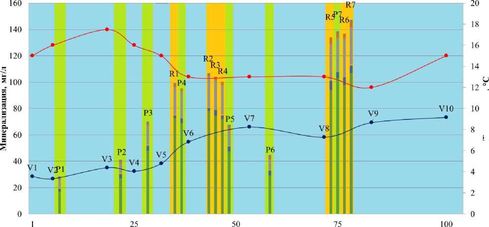 Текст научной статьи Исследование влияния родниковой разгрузки на параметры химического состава и температуру поверхностных вод верхнего течения р. Вишеры