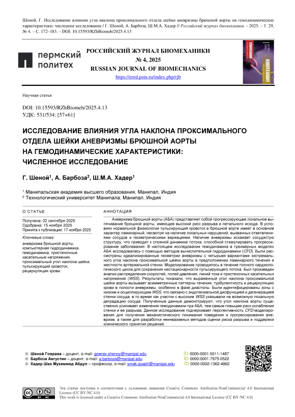 Аневризма брюшной аорты (АБА) представляет собой прогрессирующее локальное выпячивание брюшной аорты, имеющее высокий риск разрыва и летального исхода. В условиях нормальной физиологии пульсирующий кровоток в брюшной аорте имеет в основном характер ламинарный, несмотря на наличие локальных нарушений, вызванных ответвлениями сосудов и геометрическими вариациями. Наличие аневризмы искажает сосудистую структуру, что приводит к сложной динамике потока, способной стимулировать прогрессирование заболевания. В настоящем исследовании гемодинамика в трехмерных моделях АБА исследовалась с помощью методов вычислительной гидродинамики (CFD). Были рас-смотрены идеализированные геометрии аневризмы с четырьмя вариантами экстремального угла наклона проксимальной шейки аорты в предположении ламинарного течения и жесткости артериальной стенки. Моделирование проводилось в течение полного кардиологического цикла для сохранения нестационарности пульсирующего потока. Был произведен анализ распределения скоростей, полей давления, линий тока и пристеночных касательных напряжений (WSS). Результаты показали, что выраженный угол наклона проксимальной шейки аорты вызывает асимметричные паттерны течения, турбулентность и рециркуляцию крови в полости аневризмы, особенно в фазе диастолы. Были идентифицированы зоны с низким и осциллирующим WSS, что связано с эндотелиальной дисфункцией и дегенерацией стенки сосуда, в то время как участки с высоким WSS указывали на возможную локальную деградацию сосуда. Полученные данные демонстрируют, что угол наклона аорты существенно усиливает изменения гемодинамики при АБА, тем самым повышая риск ослабления стенки и ее разрыва. Данное исследование подчеркивает перспективность CFD-моделирования для получения механистического понимания поведения и прогрессирования аневризм, а также для разработки неинвазивных методов оценки риска разрыва и поддержки клинического принятия решений.