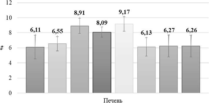 Рисунок 2 - Массовые коэффициенты печени мышей экспериментальных групп