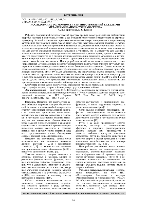 Современный технологический прогресс требует новых решений для стабилизации здоровья человека и животных, в связи с все большим техногенным воздействием на окружающую среду. Каждый год нарастает производство металлов в мире, что приводит к непрерывному загрязнению окружающей среды. Особо стоит отметить негативное влияние тяжелых металлов, которые оказывают пролонгированное и негативное воздействие на живые организмы. Одним из возможных направлений использования наночастиц селена является возможность их использования для снятия отравления тяжелыми металлами, а учитывая, что в литературе есть данные о возможности применения селеноорганических соединений в данных целях, причем в малых дозах, что свидетельствует не о прямом комплекс образовании с тяжелыми металлами, а о активизации иммунной и антиоксидантной системы организма и, как следствие, предотвращении негативного воздействия токсикантов. Нами разработан новый метод синтеза наночастиц селена. Разработанная методика синтеза позволяет синтезировать наночастицы близкого друг другу размера, что положительно должно сказаться на их биологической активности. Синтез наночастиц селена осуществлялся из дихлордиацетофенонилселенида под воздействием аммиака при стабилизации наночастиц ТВИН-80. Было установлено, что наночастицы селена способны снижать степень тяжести отравления солями тяжелых металлов на примере хлорида меди, нитрата ртути и сульфата кадмия при пероральном применении на белых мышах линии BALB/c в дозе 1 мг/кг при LD50=200 мг/кг, что представляет возможность использования данных наночастиц для предотвращения токсических воздействий на организм тяжелых металлов.