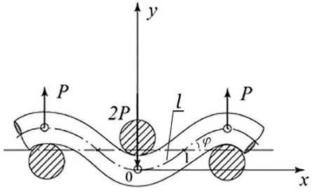 Теперь, зная координаты x и y для случая основных и уточных нитей, и зная, жесткость арамидной нити Руслан 29,4 текс при изгибе H = 3,1 cН·мм2 (жесткость при изгибе определена в соответствие с методикой (Егоров, 2010)) легко построить решение системы (1) с учетом (2) в среде MathCAD.