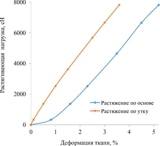 3) установлено, что разработанная ткань полотняного переплетения обладает анизотропией свойств в направлении основы и утка, которая возникает вследствие максимального изгиба основы и минимального изгиба утка, что не позволяет реализовать свойства систем нитей в одинаковой степени;